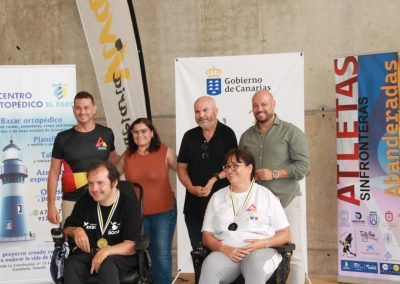 En la entrega de medallas estuvieron presentes Dña. Mari Brito, alcaldesa del municipio de Candelaria; D. Manuel González, concejal de deportes del municipio de Candelaria; D. Juan Carlos Hernández, presidente de la Federación Canaria de los Deportes para Personas con Discapacidades; y D. Juan Jesús Aguiar, presidente de Atletas Sin Fronteras.